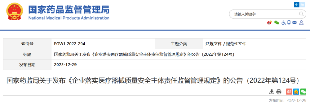 2022年12月29日,國家藥品監督管理局發布《企業落實醫療器械質量安全主體責任...